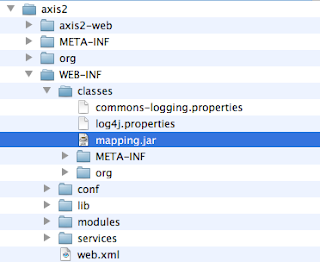 All the mapping files should go into axis2/WEB-INF/classes (assuming you have webapp as axis2). I had a bunch of files to load so I made my *.hbm.xml files into a file named "mapping.jar" and placed it in the directory. check the below figure for reference